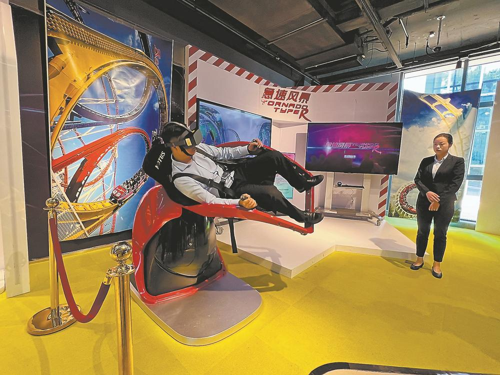 媒體記者在網龍打造的中國·福建VR體驗中間內體驗VR游戲。